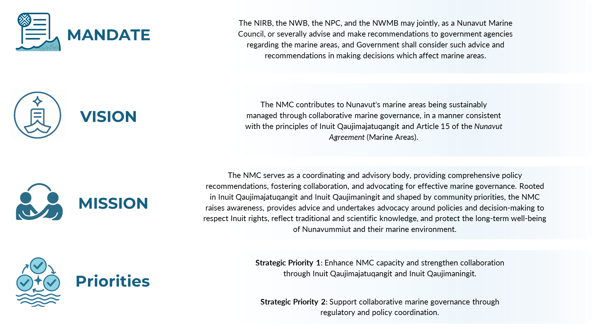 The Strategic Plan provides a clear and flexible framework to guide the NMC’s work in a rapidly evolving marine context. It focuses on strengthening collaboration among institutions, supporting informed and coordinated marine governance, and ensuring that Inuit knowledge, community priorities, and well-being remain central to marine decision-making.